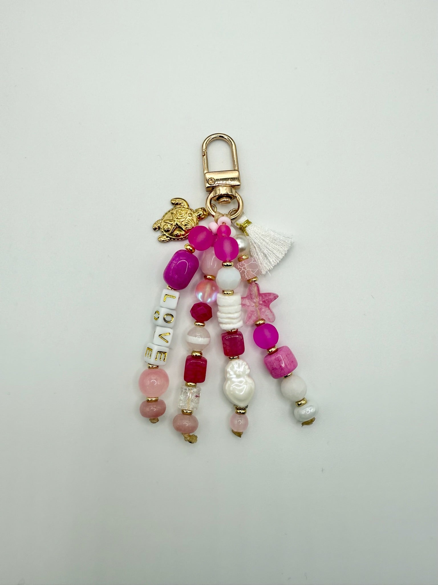 Handcrafted in radiant tones of fuchsia, blush, and pearl white with touches of gold, this keychain captures the glow of a setting sun meeting the sea. Each bead is chosen for its light and texture, creating a balance of playfulness and grace. Customizable and full of warmth, Pink Horizon adds a luminous, feminine touch to any bag or keys.